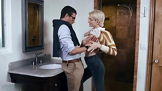 Short haired platinum-blonde with glasses, Skye Blue got fucked after giving a blowjob to a friend