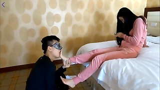 Hanedi Mari forces footslave to worship her feet while giving handjob