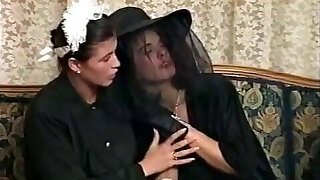 Mesmerizing brunette milf in black sundress seduced by redhead milf
